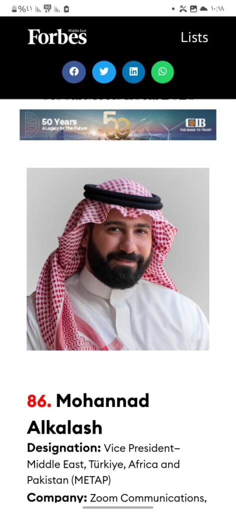 وفي تعليقه على هذا التقدير، قال الكلش: “يسعدني أن أُكرّم ضمن قائمة Forbes 2025، فهذا التقدير يعكس جهد فريق Zoom المذهل، وثقة شركائنا وعملائنا”.، مؤكدا على مواصلة الاستثمار في الكفاءات المحلية والبنية التحتية والابتكار لخدمة منطقتنا العربية بشكل أفضل”.